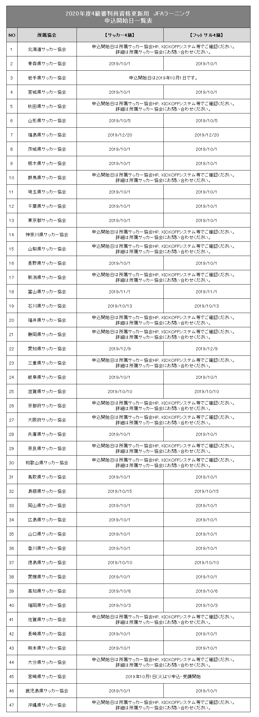 サッカー/フットサル 4級JFAラーニング申込開始日一覧表