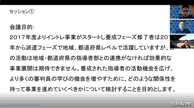 こどもの日の5月5日(火・祝)に、地域審判指導者部長・イントレマネージャー合同会議をオンライン形式にて行いました。9地域の代表者がそれぞれ参加し、1時間のセッションを3回、合計3時間実施しました。 ブレイクアウトセッションを採用して、オンライン上でグループディスカッションも実施し、時間が足りないと感じるほど活発に意見交換がなされました。