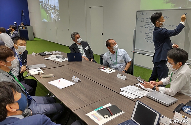 会議の前半では、主にJFA審判委員会からの伝達がなされ、後半には、JFA審判委員会から示されたミッションやアクションプラン、審判資格登録制度改革案について、グループディスカッション形式で意見交換が行われることになりました。グループディスカッションでは、それぞれのグループで各地域の実情や実態が共有され、各議題について活発に意見交換する姿が見られました。意見交換後には、各グループによる発表が行われ、それぞれのグループで話し合われた内容が共有され、今後JFA審判委員会のビジョン・ミッションを達成するための貴重な意見が示されました。