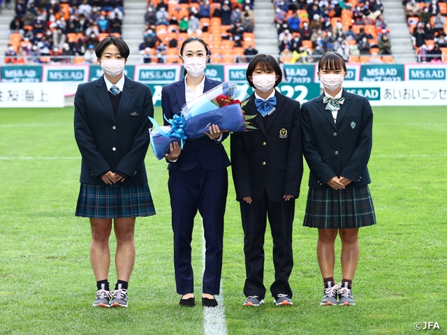 セレモニーでは、長野県の女子ユース審判員の皆さんから花束を贈呈され、山下審判員は大会に対する意気込みを語りました。