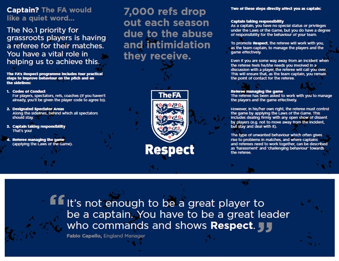 チームのキャプテンとして、君の重要な役割は、サッカー選手にとって最も大切なことを達成することを助けてほしい。イングランドサッカー協会がグラスルーツフットボールを対象に行った過去最大の調査で明らかになったことである。すべてのゲームにレフェリーにいてもらうこと。
