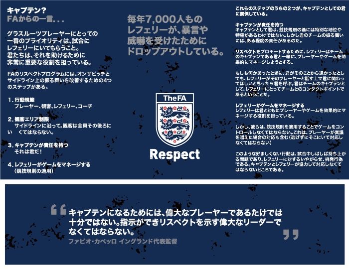 キャプテンズガイドというリーフレットと、リスペクトが明記されたキャプテンのアームバンドを配布し、この役割を遂行するキャプテンを激励しています。