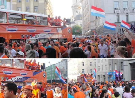 またオランダが一次リーグの3試合を戦ったウクライナのハルキウでは、街の中心部に設けられたファンゾーンからスタジアムまでの約5kmの道路の片側が試合当日にオランダサポーターのために車両通行止めにされていました。オレンジのユニホームを着たオランダサポーターは試合前にファンゾーンに集合し、踊ったりして大いに盛り上がったあとファンゾーンからスタジアムまでを、まるでカーニバルか優勝パレードのように進んでいきました。これはオランダのファンとその文化をサポートするために開催自治体のハルキウ市が協力して車両を通行止めにして可能となったものです。地元の人々もまたその行進を道路わきから見物して楽しんでいました。