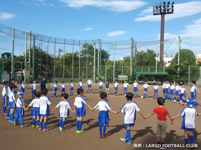 LARGO.FCは東京都荒川区を拠点に活動するサッカークラブだ。1995年4月の設立以来、続けてきた伝統がある。それは、第4種(小学生)は練習の始まりと終わりに必ずスタッフを含め全員で手をつないで、輪をつくり、あいさつをすること。日課として同じグラウンドで練習する全ての仲間にあいさつをすることで、皆でプレーをする喜びや、人を思いやる気持ちを育んでいる。