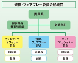 日本サッカー協会(JFA)が目指す「サッカーに携わる全ての人々を『サッカーファミリー』として迎え入れ、その拡大を図るために、悪いことは罰すれば良いだけでなく、その前に『その行動をなぜしないといけなかったのか』『そうさせたのは何が原因だったのか』を考える」ために、規律・フェアプレー委員会の組織の充実を図る目的で、以下の3つの部会を発足しました。各部会は、部会長を中心に活動しています。