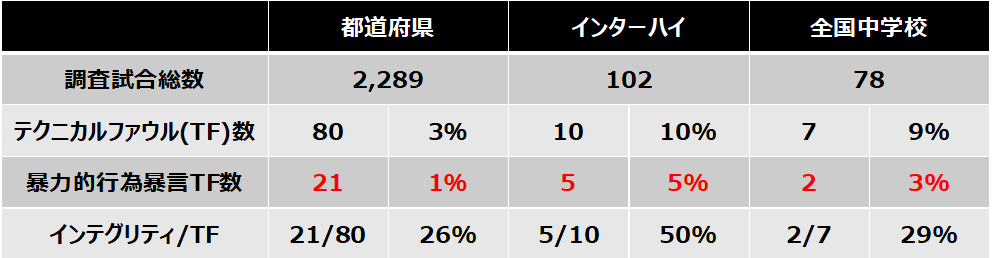 テクニカルファウルについては数値化し、実態を見える化するために調査を実施しましたが、その結果は表1の通りで、全国大会の方が多く発生していました。結局、強いチーム、勝っているチームの指導者が、相変わらず暴力的行為や暴言を続けていることが分かりました。