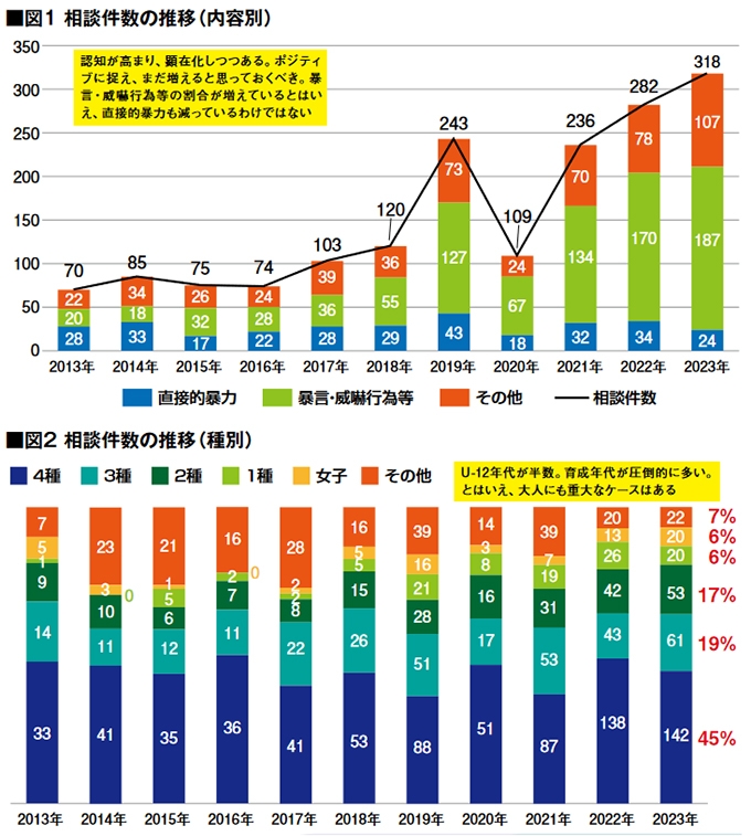 2013年より、あらためて取り組み始めたサッカー現場での暴力・暴言の根絶。日本サッカー協会(JFA)の暴力等根絶相談窓口に上がってくる件数の推移は、図1・2の通りです。全体の件数は増える一方ですが、これは取り組みを実施しているにもかかわらず状況が悪化しているというよりは、世の中の認識が高まったことで顕在化したと見られており、しばらくは増えるものと捉えるべきです。このことは、国際サッカー連盟(FIFA)のコースでも共有されています。