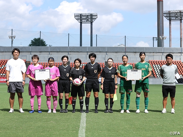 JFA U-18女子サッカーファイナルズ2023でも、2022年と同様に事前にキャプテンミーティングの実施、宣言ボードの作成・交換、コイントスの際に両チームの監督も交えての写真撮影、両チームと審判団が入り交じってリスペクト旗とともに写真撮影などを行いました。両チームのキャプテンが自分の言葉でしっかりとリスペクト宣言をしてくれました。試合を見に来ていただいた観客の皆さんにもお伝えすることができたと思います。