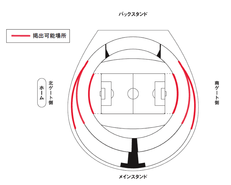 ゴール裏に掲出する場合は、スタンド最前部の手すりから3メートル以上(既に設置されているスポンサーバナーから1.5メートル以上)離して設置して下さい。尚、使用するロープ類は各自でご準備ください。