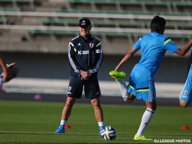 スタンドから約150人のファンが見守るなか、練習前にピッチ中央に選手を集めたアギーレ監督は「新しいプロジェクトが始まる。目的は2018年のロシア大会へ行くことだ」と伝え、練習が始まりました。