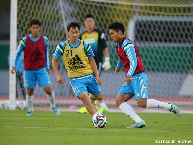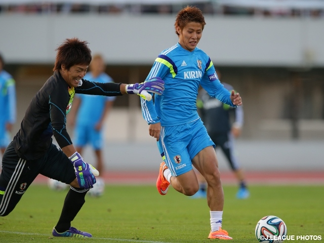 また、GK川島永嗣選手(スタンダード・リエージュ)と共に、所属クラブの試合日程で合宿2日目からの合流になったFW岡崎慎司選手(1.FSVマインツ)は、長旅の疲れを感じさせない軽快な動きでゴールを決めていました。