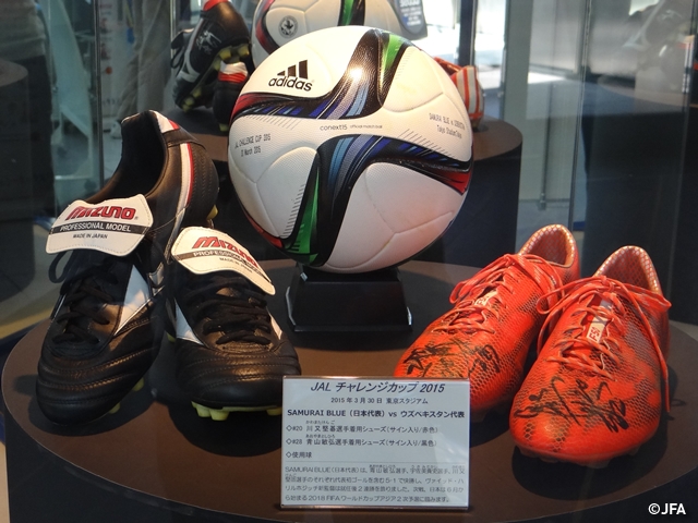 キリンチャレンジカップ2015 JALチャレンジカップ2015での使用球、SAMURAI BLUE(日本代表)のサイン入りユニフォームやスパイクを展示