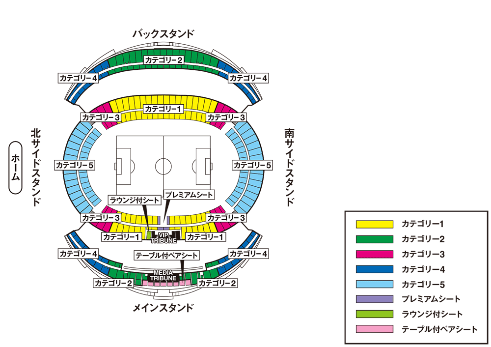 - ゴール裏(カテゴリー5)のエリアでは、立ち上がって応援されるサポーターがいらっしゃる場合があります。このエリアは自由席のため、各エリア内でのお席の移動は可能ですが、混雑時等は移動が難しい場合もあります。そのため、着席して観戦を希望されるお客様は、指定席をお勧めします。