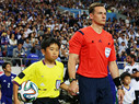 ルールに基づいて、選手と一緒にサッカーの試合を作るレフェリーをエスコートします。また、試合前の大事なセレモニー、両チームのキャプテンを交えたコイントス等のお手伝いをします。