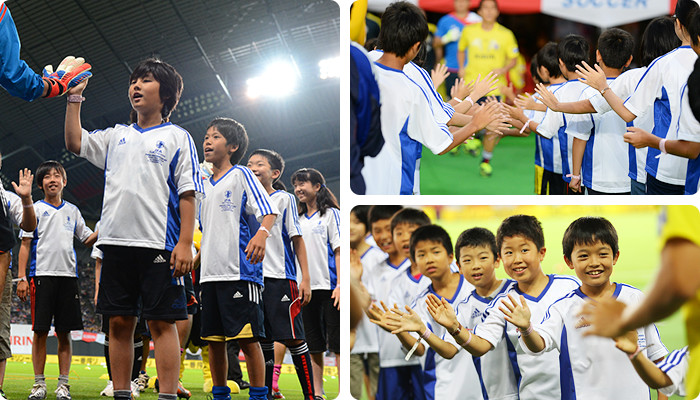 たくさんのお客さんが見守る中、あこがれの選手たちと手をつないでピッチに入場します。キックオフ直前のピッチの緊張感を味わうことができますよ。