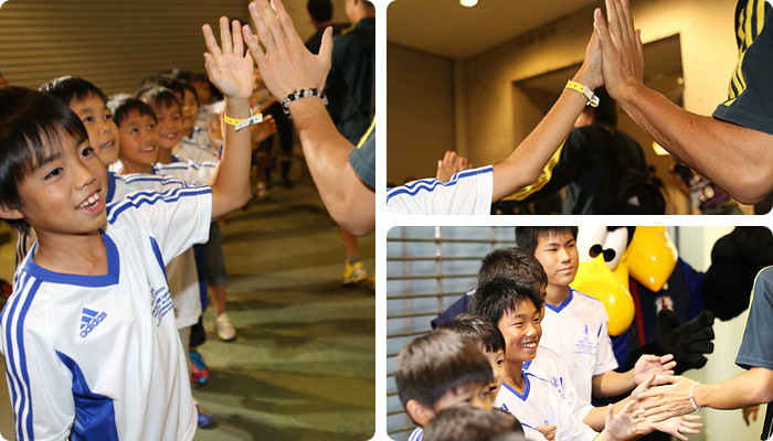 試合前のウォーミングアップに向かう選手たちを、花道を作って出迎え、ハイタッチして応援します。選手を迎えたあとは、ピッチ横でウォーミングアップを見学できます。あこがれの選手のプレーを間近で感じるチャンスです。