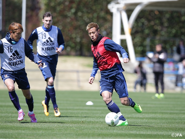 一方、出場機会がなかったFW本田圭佑選手(ACミラン)や途中出場したMF香川真司選手(ボルシア・ドルトムント)たちは、ヴァイッド・ハリルホジッチ監督が見守るなか、5対5のゲーム形式やクロスボールに合わせるシュート練習などで汗を流しました。
