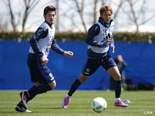 春の陽射しと冷たい北風が同居する晴天の下での練習では、5-0で圧勝したアフガニスタン戦に先発したFW岡崎慎司選手(レスター・シティ)ら11人は、ランニングやストレッチなどの軽めの調整でリカバリーに務めました。