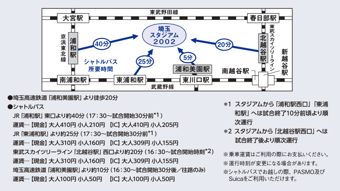 埼玉スタジアム2002⇒東京駅/池袋駅/横浜駅への直行バスを運行します。(有料・事前予約制)