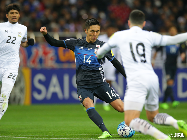 SAMURAI BLUE(日本代表)は、代表戦初ゴールとなった久保裕也選手の先制点と、2年ぶりの代表復帰となった今野泰幸選手の追加点により2-0で勝利しました。勢いにのった日本は続く第7戦でタイ代表を埼玉スタジアムに迎え、4-0の勝利を収めて2連勝とし、勝点を16に伸ばしサウジアラビアを抜いてグループBで首位に立ちました。