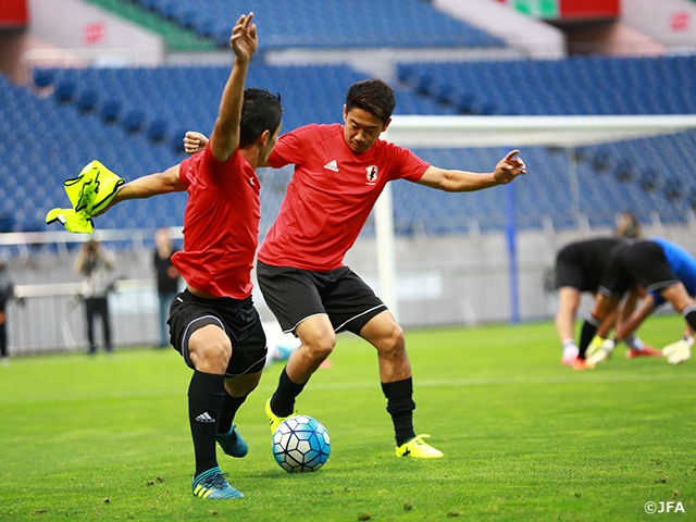足の負傷から回復したMF長谷部誠選手(アイントラハト・フランクフルト)と、週末の試合で足に違和感を覚えていたDF長友佑都選手(インテル・ミラノ)は前日まで別調整でしたが、この日はボール回しやランニングに加わって体を動かしていました。