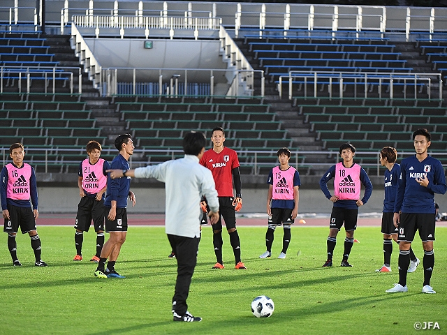 この様子を、この日が練習初日だったDF植田直通選手(セルクル・ブルージュKSV)、MF中島翔哉選手(ポルティモネンセSC)、MF堂安律選手(FCフローニンゲン)、MF南野拓実選手(ザルツブルク)も注視。ランニングやストレッチなどの別調整を終えた後もピッチサイドに留まって、監督の意図を少しでも早く汲み取ろうと、互いに会話を交わしながら、熱い視線を送っていました。