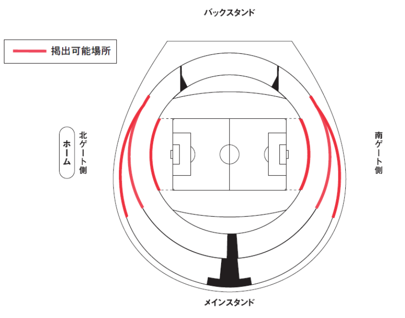 『ゴール裏に掲出する場合は、スタンド最前部の手すりから3メートル以上(既に設置されているスポンサーバナーから1.5メートル以上)離して設置して下さい。尚、使用するロープ類は各自でご準備ください。』