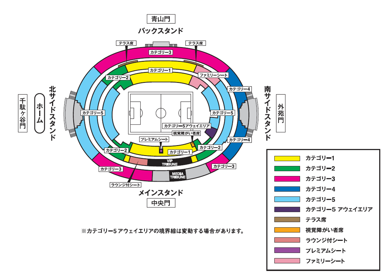 - カテゴリー5(ゴール裏南の1層)とカテゴリー5(アウェイエリア)の境界線は変動する場合があります。
