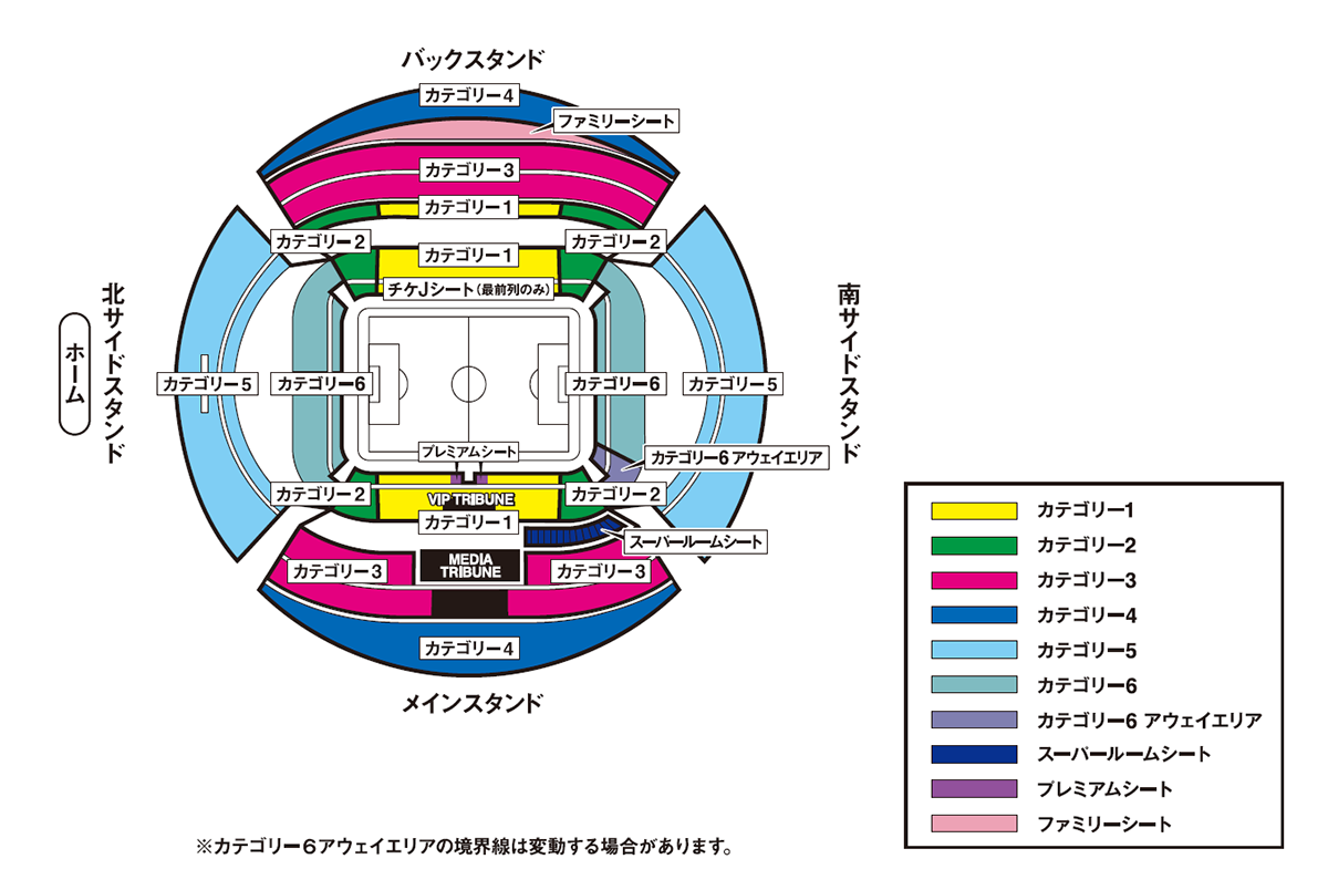 - カテゴリー6(ゴール裏・南1階)とカテゴリー6(アウェイエリア)の境界線は変動する場合があります。