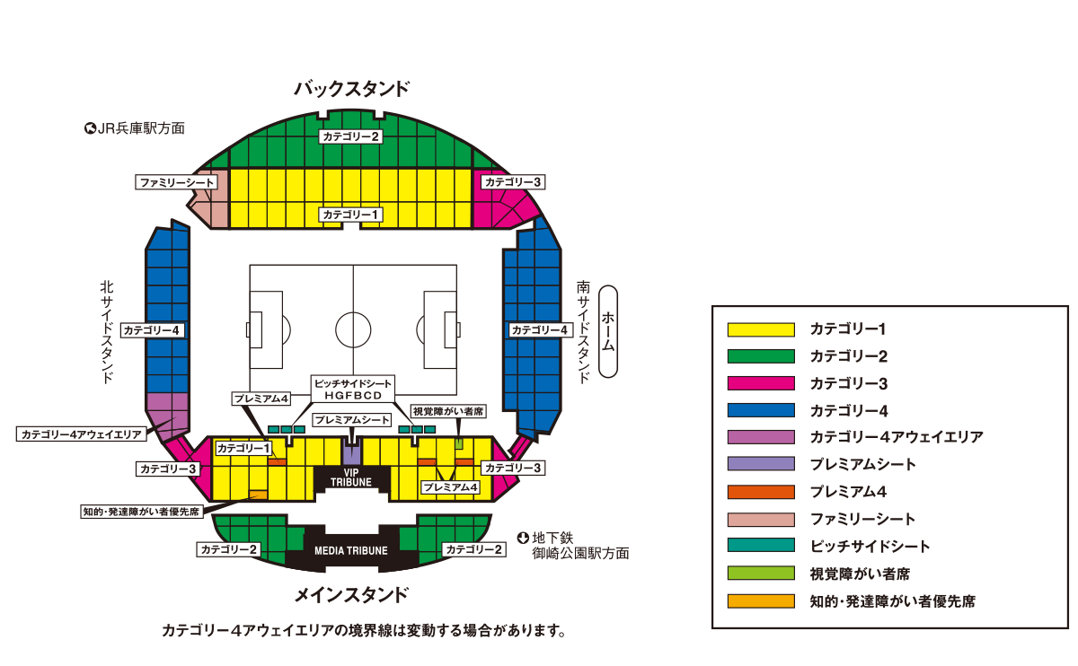 - カテゴリー4(ゴール裏)とカテゴリー4(ゴール裏アウェイエリア)の境界線は変動する場合があります。