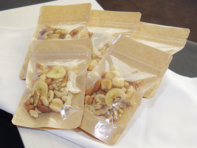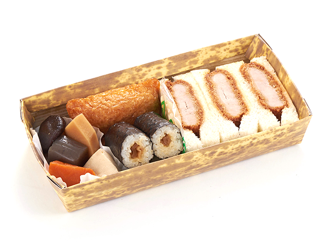 〈軽食〉カツサンド弁当、ミックスナッツ、コーンスープ、お汁粉