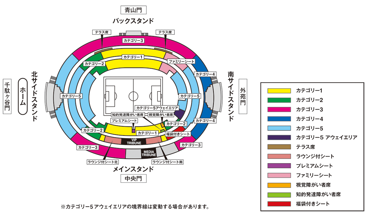 - ・カテゴリー5(ゴール裏南の1層)とカテゴリー5(アウェイエリア)の境界線は変動する場合があります。