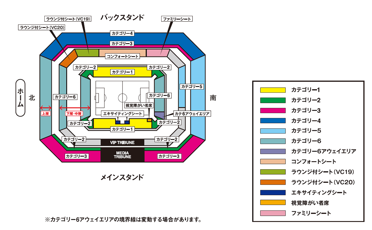 - カテゴリー6(ゴール裏・南1階)とカテゴリー6(アウェイエリア)の境界線は変動する場合があります。
