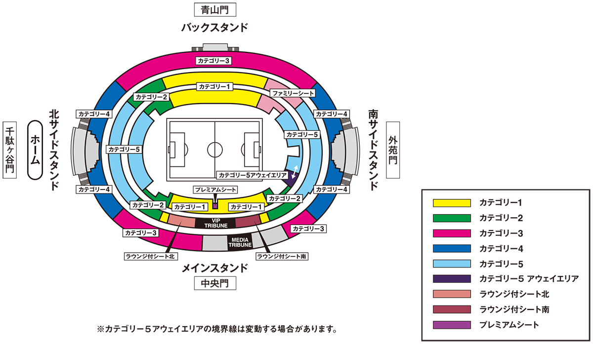 - ・カテゴリー5(ゴール裏南の1層)とカテゴリー5(アウェイエリア)の境界線は変動する場合があります。