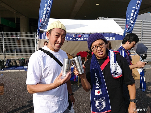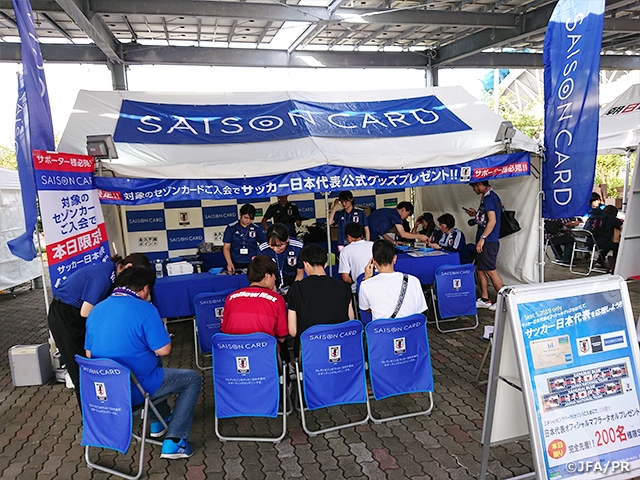 スタジアムに入る前後では色々なブース、イベントがあり、試合観戦前に楽しむ事が出来ました。スタンプラリーでは各選手を探して知る楽しさがありました。ファミリーマートブースで缶ビールを購入した際に、JFAとKIRINのロゴ入り紙コップへ移してくれたことで更に気持ちが上がりました。