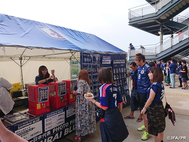 次に過去の代表戦で撮影された写真を販売しているJFAフォトブースへと移動。過去のスタメン写真と選手単体のフォトガチャが販売されています。ちょうどお目当ての選手が当たったサポーターがいらっしゃって、声を張り上げ喜んでいました。これだけ選手がいる中で推し選手が当たったら、自然と声が出てしまいますよね!