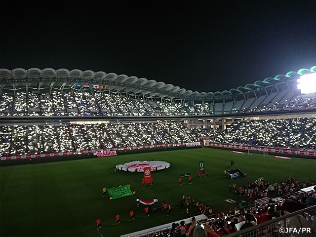 レプリカユニフォームとタオルマフラーで青くなることで、周りの日本代表サポーターの皆さんとの一体感を感じることができました。スタジアム全体で応援した時の一体感は日本代表戦ならではだと思います。イベントでは、JFAフットボールパーク/PKチャレンジで、Jリーグ初期の頃からご活躍された本並健治さん、小島伸幸さんを拝見することができ、参加していなくても見ているだけで楽しめました!選手入場時の暗転演出が素晴らしかったです!