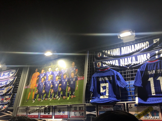 JFA STOREではユニフォームやタオルマフラー、エンブレムキーチェーンなど多くのグッズが販売していました。