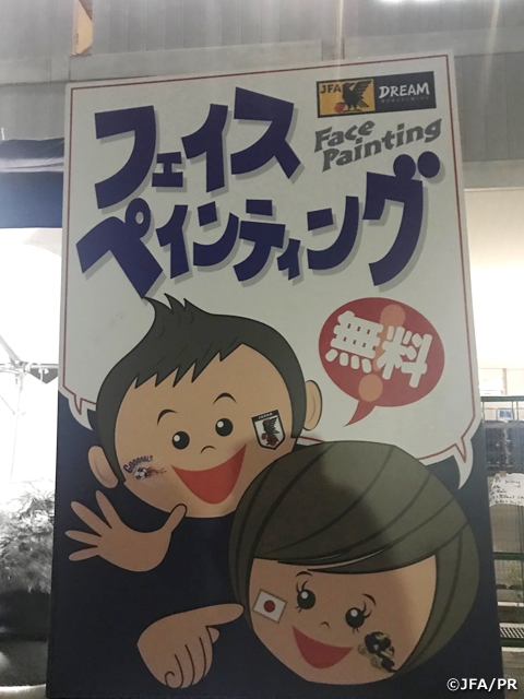 様々なブースをまわっていると時間もあっという間で、18時35分から選手のウォーミングアップがあるとのことだったので、その前にスタジアムの中に入りました。入ってすぐにフェイスペインティングと記念撮影ボードで記念写真を撮れるところがあったので、体験してきました。