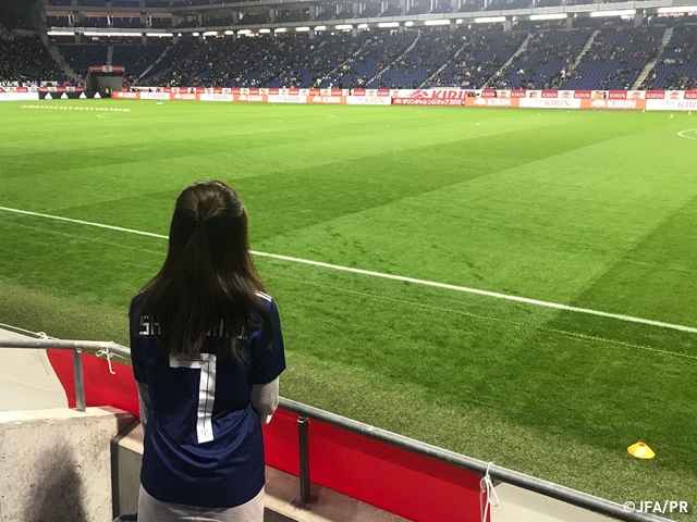 今回観戦レポーターに選ばれた時は本当に驚きました。まさか自分が当たるとは思っていなかったので、当日までドキドキしていました。スタジアムで代表戦の試合を観戦するのは初めてではなかったのですが、ブースをまわったのは初めてでした。実際ブースに足を運んでみると、いろんなプレゼントが貰えたり、記念写真が撮れたりなど、試合だけでなくスタジアムでこんな楽しみ方があるんだと知ることができました。レポーター体験の楽しみの1つであったピッチやロッカールーム、記者会見場を見学できたことも嬉しかったです。選手がより良い環境で試合に臨むことができるよう様々な工夫がされていてとても感動しました!!試合が始まって最初に感じたことは、選手のプレーの迫力です。テレビで観ていても凄いなと感じるのですが、実際生でみてみると、そのスピード感や技の凄さがより感じられます。また、大きな声でサポーターの方が応援している姿も迫力があります。スタジアム内に一体感も生まれるので、気づけば私も一緒になって応援していました。チャントも覚えやすいものばかりなので誰でも一緒に歌って応援できるところもいいなと感じました!!