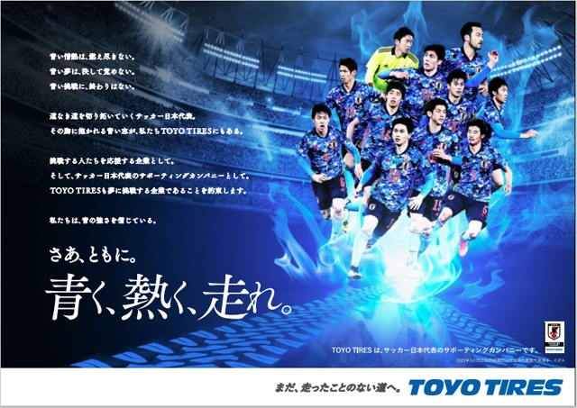 JFA創立100周年の節目となる今年、日本屈指のタイヤメーカーであるTOYO TIRE様にサッカー日本代表のサポーティングカンパニーとしてご支援いただくことになりました。これまでも日本代表のアウェイゲームなどの看板スポンサーとしてサポートしていただきましたが、大舞台への挑戦を控えた中、しかもコロナ禍の厳しい状況下でサポートいただくことは、日本代表チームにとって大きな力になります。また、”青“というイメージカラー、”夢に挑戦する企業“といった共通点もあり、心強く思います。TOYO TIRE様のご期待に応えるよう、強く、魅力ある代表チームをつくってまいります。