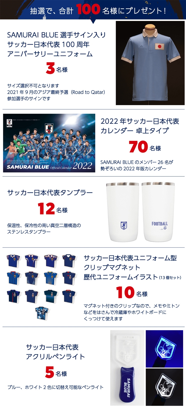 11月30日(水)までのあいだに、キャンペーンに応募した方の中から抽選で、SAMURAI BLUE選手サイン入りサッカー日本代表100周年アニバーサリーユニフォームや2022年サッカー日本代表カレンダー 卓上タイプなどをプレゼントします。そのほか、アウェイゲーム観戦に役立つプレゼントを取りそろえています。