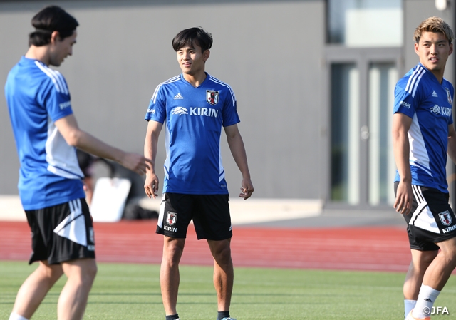 さわやかな快晴の空の下、前日の練習では軽めの調整だったパラグアイ戦の先発組なども出場時間の長かったメンバーも合流。負傷の影響で前日まで部分合流だった守田英正選手(CDサンタ・クララ)も全メニューを精力的にこなしましたが、負傷でリカバリー調整中の冨安健洋選手(アーセナル)と足に違和感を覚えた浅野拓磨選手(VfLボーフム)は別メニューで体を動かしました。