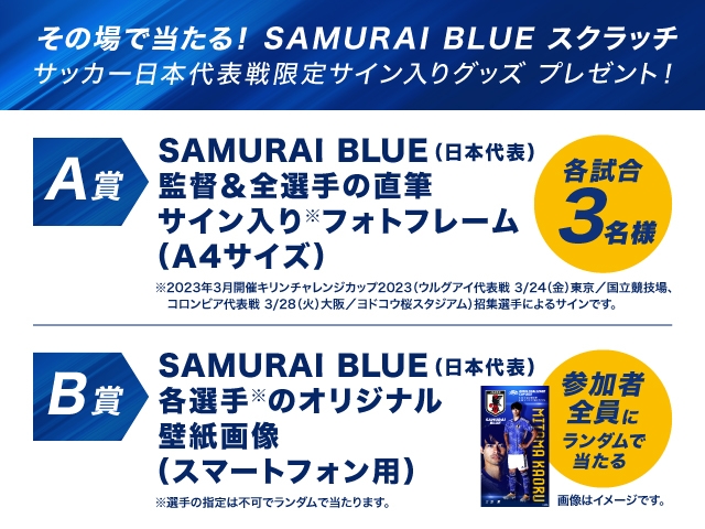 その場で当たる!SAMURAI BLUE スクラッチ ~サッカー日本代表戦限定サイン入りグッズ プレゼント!