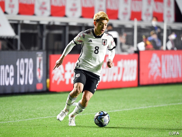 日本は24日(金)のウルグアイ代表戦(1-1)から先発4人を変更。4日前の試合で交代出場直後に同点ゴールを決めた西村拓真選手(横浜F・マリノス)をトップ下、アシストした伊東純也選手(スタッド・ランス)を2列目右に、左サイドバックには代表デビューとなったバングーナガンデ佳史扶選手を置き、1トップには昨年9月のキリンチャレンジカップ2022アメリカ代表戦以来の出場の町野修斗選手(湘南ベルマーレ)を起用しました。
