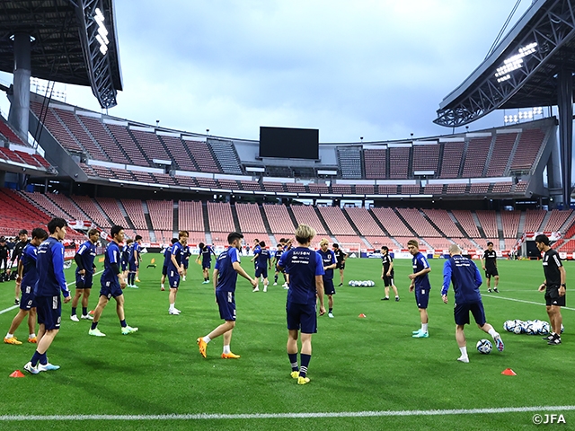 SAMURAI BLUEはこの日の夕方から試合会場で公式練習に臨み、体調不良でチームを離れた川村拓夢選手(サンフレッチェ広島)と別調整の川﨑颯太選手(京都サンガF.C.)を除いた選手24人が冒頭15分以外を非公開にして最終調整を行いました。