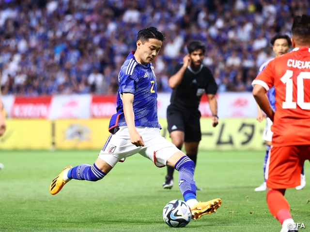 相手の出方と守備の仕方を見ながら、どうバランスをとって守備も攻撃もやっていくか、伊東選手、遠藤選手、板倉選手ともいいコミュニケーションがとれました。前半、立ち上がりから相手をしっかり見た上で、チームとしてやるサッカーをしっかりできたので、いいサッカーができたと思います。守備は、クロスまで運ばれるシーンもありましたし、前半最初の方で、揃っていないまま食いついて前に出たところなど個人的には反省点はたくさんあります。攻撃でも、クロスやドリブルで侵入するなど、もっといろいろとできると思うので、まだまだ物足りないと感じています。チームとしては、3月シリーズで(サイドバックが)中に入るというチームのコンセプトがあって、ちょっとそれを意識しすぎたというのがあったので、今回は相手の状況を見ながら、いつ、どのタイミングで入るのが効果的かを常に意識しようと考えていました。うまく受けられたところもありますし、もっといいところで受けられたところもあると思いますが、3月シリーズよりは良かったと思っています。