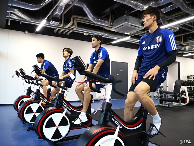 この日の練習には選手20人が参加しました。当日到着した冨安健洋選手(アーセナル)、遠藤航選手(リバプールFC)、久保建英選手(レアル・ソシエダ)、菅原由勢選手(AZアルクマール)は室内でバイクを漕ぐなど軽めの内容で体をほぐしました。