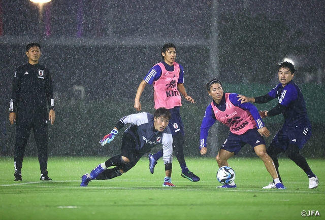 途中から降り出した激しい雨にずぶ濡れになりながらも、給水ブレイクで選手の組み合わせを何度か変えてミニゲームを実施。選手たちは攻守の素早い切り替えなどを意識しながら連係を確認し、南野拓実選手(ASモナコ)や古橋選手らが軽快な動きを見せてゴールが生まれると、傘をさして見守る多くのファンから歓声が上がっていました。