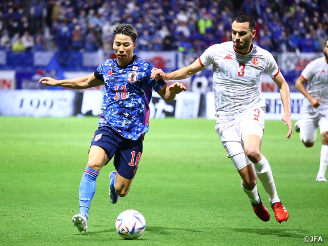 チュニジアとの対戦は、昨年6月に大阪府で行われたキリンカップサッカー2022の決勝以来、約1年4カ月ぶりとなる。同試合で北アフリカの強豪は底力を見せつけ、現在はガンバ大阪に所属するイッサム・ジェバリの得点などで3-0と快勝し、見事に優勝カップを持ち帰った。「秩序だった守備ができるのが強み」(ジャレル・カドリ監督)というチームはSAMURAI BLUE(日本代表)の攻撃を堅守でしのぎつつ、カウンターアタックを生かして得点を積み重ねていった。